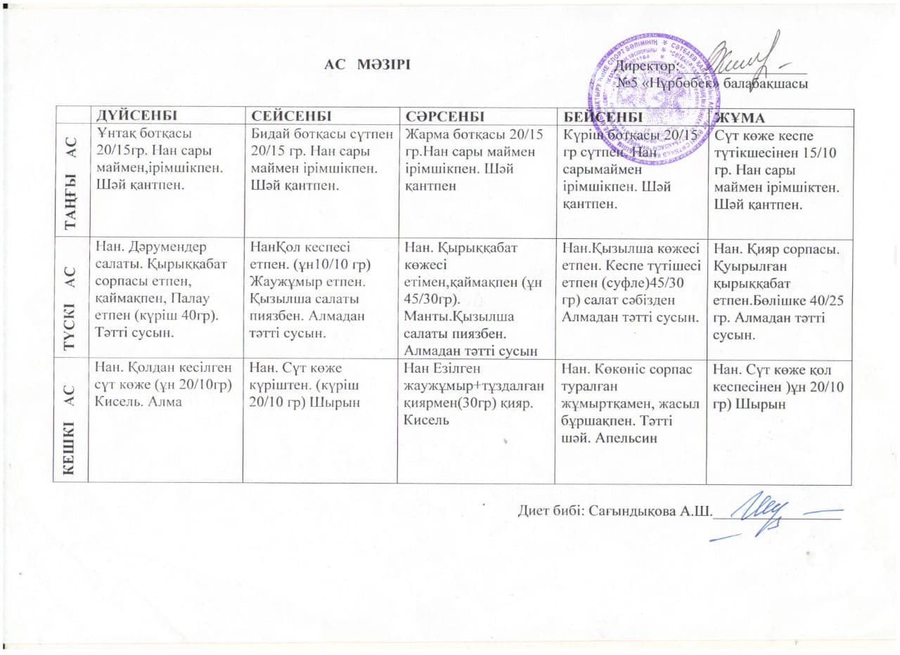 Бала денсаулығының маңызды факторларының бірі-ұтымды тамақтануды ұйымдастыру және оны білім беру процесінде көрсету. Дұрыс тамақтану-бұл ұзақ және жемісті өмірдің негізі, денсаулық, сергектік КЕПІЛІ, түрлі аурулардың пайда болуының кепілі. Сондықтан, балабақшаның жұмысы тұрғысынан дұрыс тамақтану мәселесі маңызды орындардың бірін алады. Балабақшада тамақтану топтық бөлмелерде ұйымдастырылған. Барлық пісіру циклі ас блогында жүреді. Ас блогы 100% кадрлармен жабдықталған. Ас блогының үй-жайы бірінші қабатта орналасады, жеке шығатын есігі болады. Тамақ өнімдерін танспорттау жеткізушілердің арнайы автокөлігімен жүзеге асырылады.