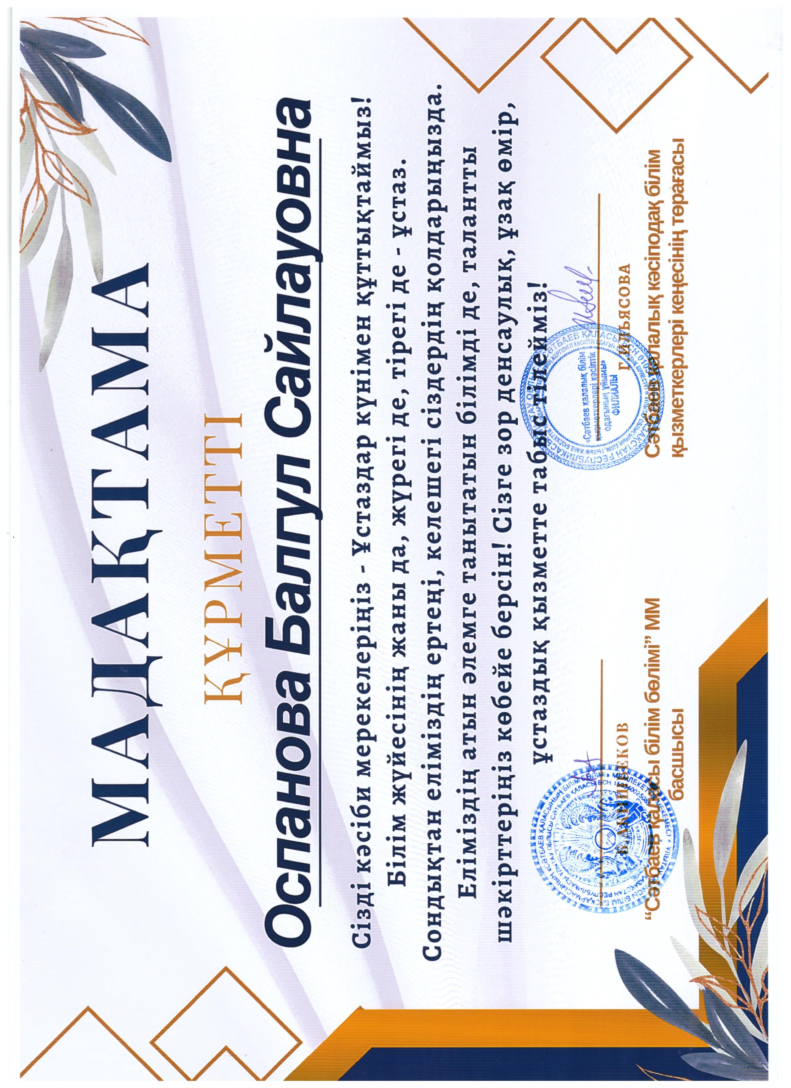 Білімқұмар балаларға арналған Республикалық «Үркер» зияткерлік орталығынан Жас өреннің бойына білімге деген құштарлық нәрін себе білгені үшін бөбекжайдың атына алғыс хат пен мүсінше белгі берілді. Сонымен қатар топтардың тәрбиешілері алғыс хат пен дипломдармен марапатталды.